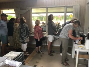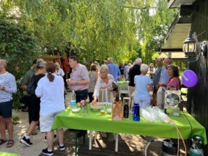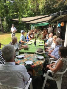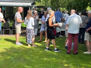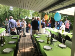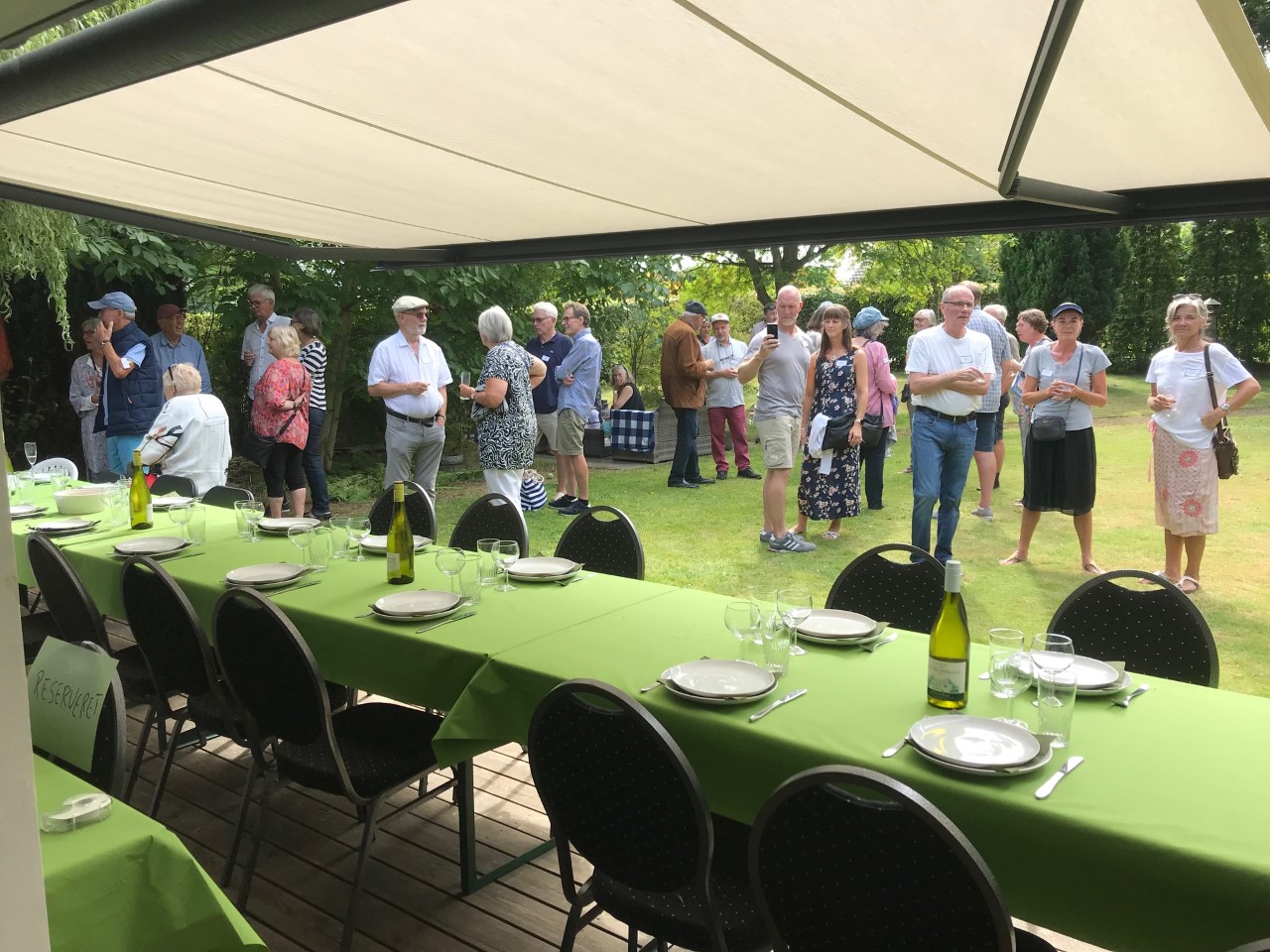 Som vært var det indledningsvis noget surrealistisk at se 74 gæster stå på græsplænen med en velkomstdrink i hånden og høre summen af snakken og interesse for hinandens selskab. Men surrealismen opløstes i erkendelse af, at det kan lade sig gøre at arrangere en fest med så mange deltagere fra foreningen.