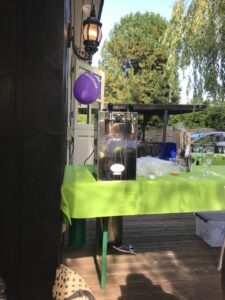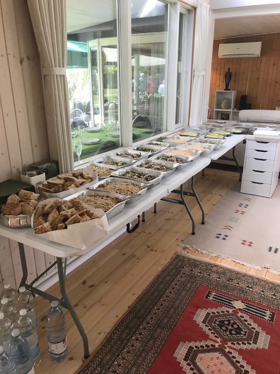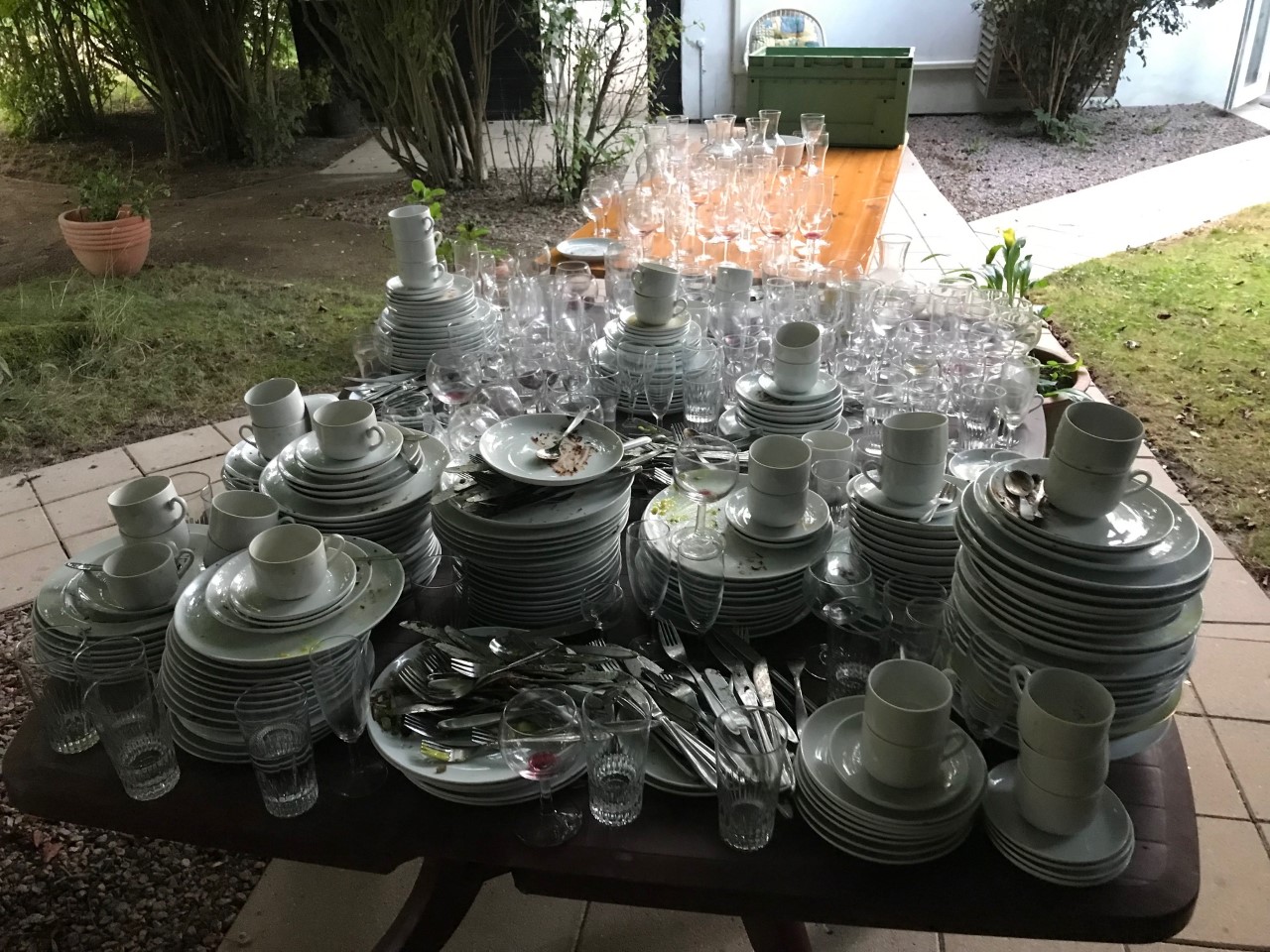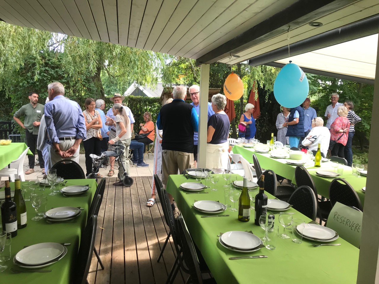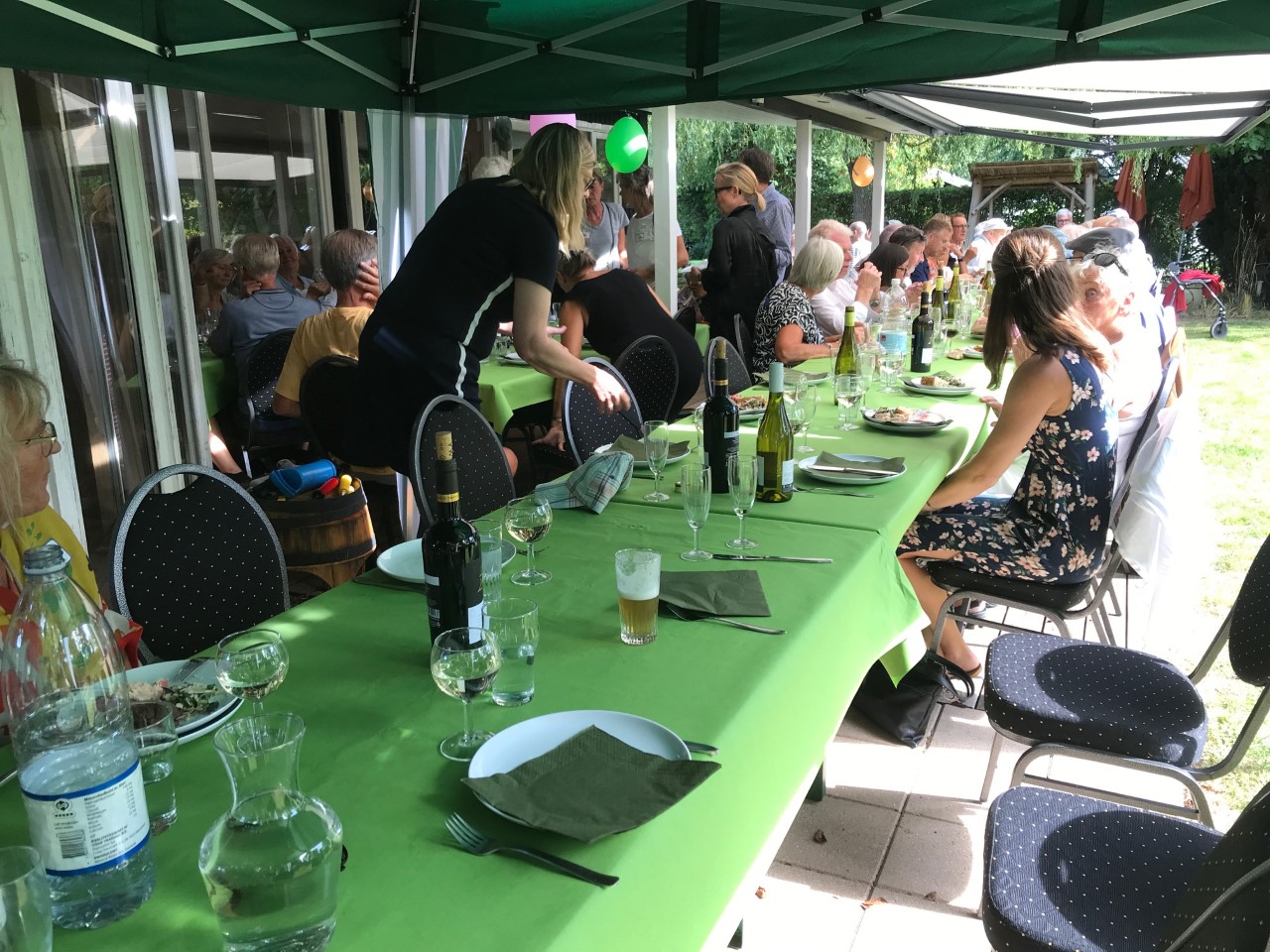 Vi havde dækket op på en udvidet overdækket terrasse, hvor der lige præcis kunne være 74 glade mennesker ved 11 borde, hvis vi rykkede lidt sammen. Buffeten var holdt indendørs i en omarrangeret stue så det var muligt for de mange fremmødte at gå til fadet fra deres plads på terrassen. Der var linet op til petanque og udendørs skak, men der blev ikke brug for disse aktiviteter, da gæsterne havde rigeligt at gøre med at hygge sig med hinanden ved bordene og rundt omkring i havens kroge.